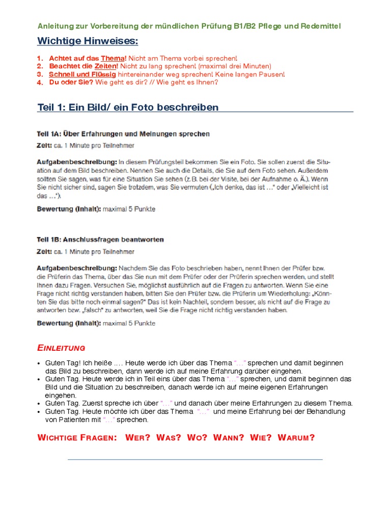 Anleitung zur Vorbereitung der mündlichen Prüfung B1-B2 Pflege und Redemittel
